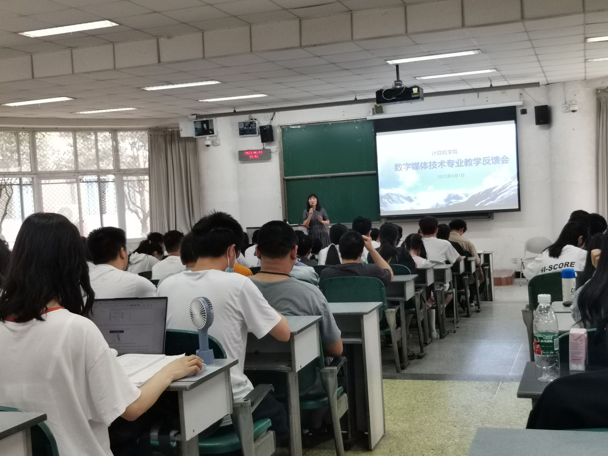 陈敏书记向全体参会学生介绍了学院通过《学情数据分析报告》《在校生学习体验报告》、学生座谈等渠道收集的与数字媒体技术专业相关的专业、课程、学习、学风情况,并表示,学院非常重视同学们的意见和建议,接下来会通过多种途径改善数媒各年级学习状况。
