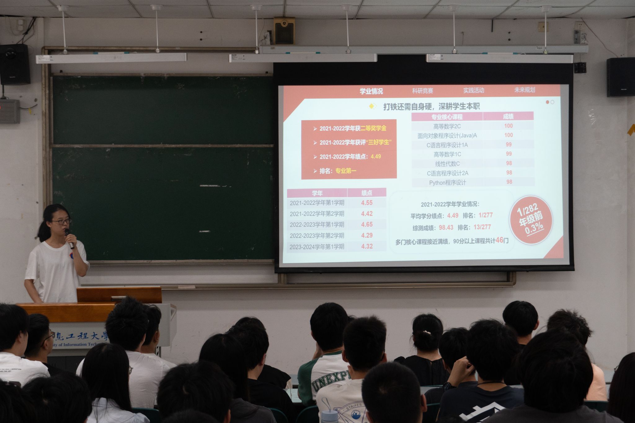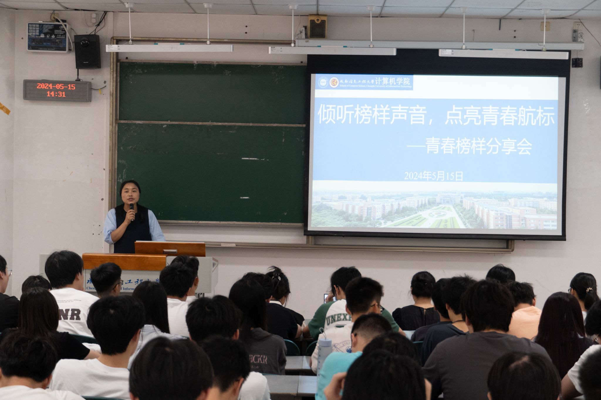 余弘丽分别介绍了2位青春榜样取得的成绩,强调了青春榜样们所获的荣誉是他们踏实勤奋、不懈努力的结果。随后,2位青春榜样以诚挚的言辞和真挚的情感,向在座的同学们分享了自己的学习历程、学习规划、专业探索和成长的感悟,讲述了他们在学习过程中遇到困难、挑战、迷茫时,如何克服困难,突破自我的心路历程,强调到适合自身的学习方法、严格的学习时间管理和清晰的职业规划对个人成长的重要性,鼓励同学们要珍惜大学时光,认真学习专业基础知识,积极参加学科竞赛,夯实专业知识,提升专业能力。最后,余弘丽对青春榜样们的努力和成绩给予了高度评价,希望全体同学能够以他们为榜样,脚踏实地,勇于尝试,为实现自身目标努力奋斗。同时,对在青春榜样评选中获得“十佳文明”学风班荣誉的计科225班进行了表扬,对班级同学们的付出与努力进行了肯定。