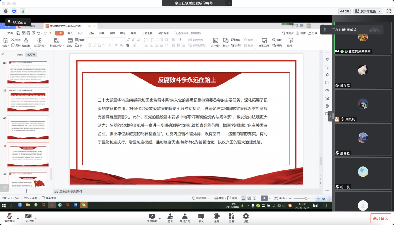 厉威成以党的二十大报告中“党找到了自我革命这一跳出治乱兴衰历史周期率的第二个答案”作为引入,围绕党的自我革命永远在路上,从反腐败斗争使我们党赢得历史主动讲起,谈到新时代反腐败斗争积累的重要经验,再到一体推进“三不腐”将反腐败斗争进行到底,为党员同志们带来了一堂生动精彩的党课。
