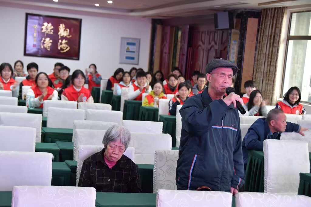 活动期间,志愿者们精心设计了多个环节。在养生知识分享中,他们用通俗易懂的语言为老人们讲解饮食搭配、适宜运动和心理健康等知识,老人们认真聆听、积极互动,现场氛围温馨融洽。随后的文艺表演环节,一曲《相亲相爱》搭配手势舞,点燃了现场气氛。志愿者们还手把手地教老人们学习简单的手势舞动作,老人们在音乐中感受着陪伴的快乐。