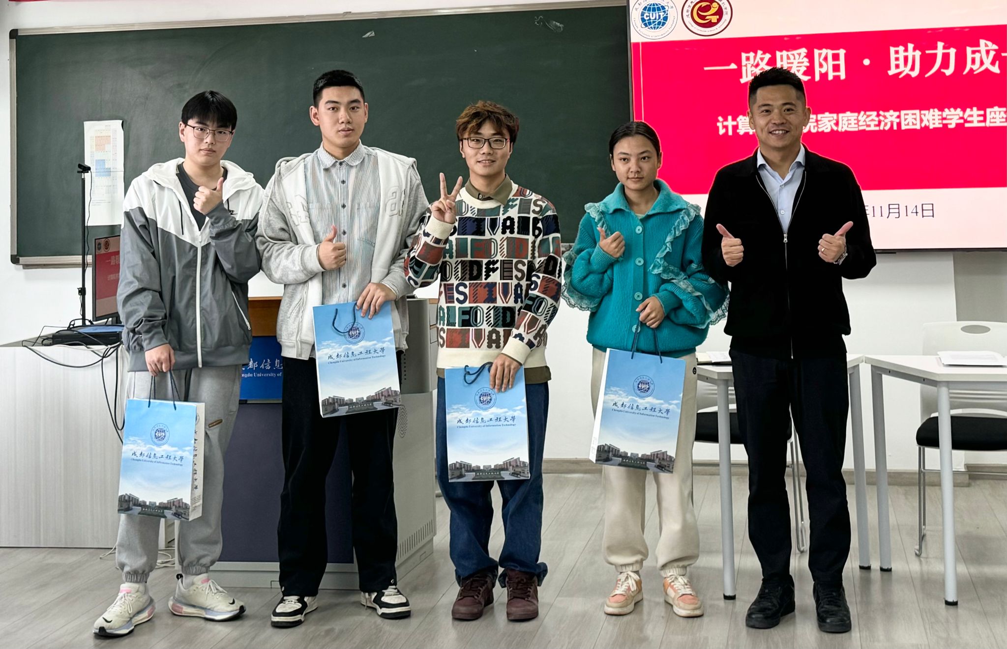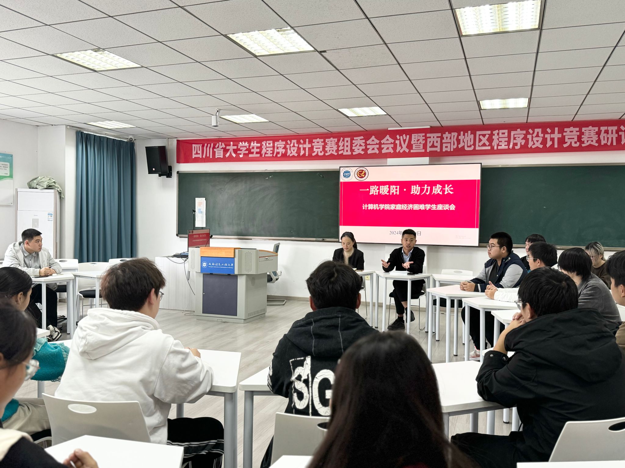 11月14日,“一路暖阳 助力成长”家庭经济困难学生座谈会在H5201教室召开。学院党委副书记、纪委书记倪涛,学院辅导员代表以及家庭经济困难学生代表参加了本次座谈会。座谈会由学院学生科科长江玉菡主持。
