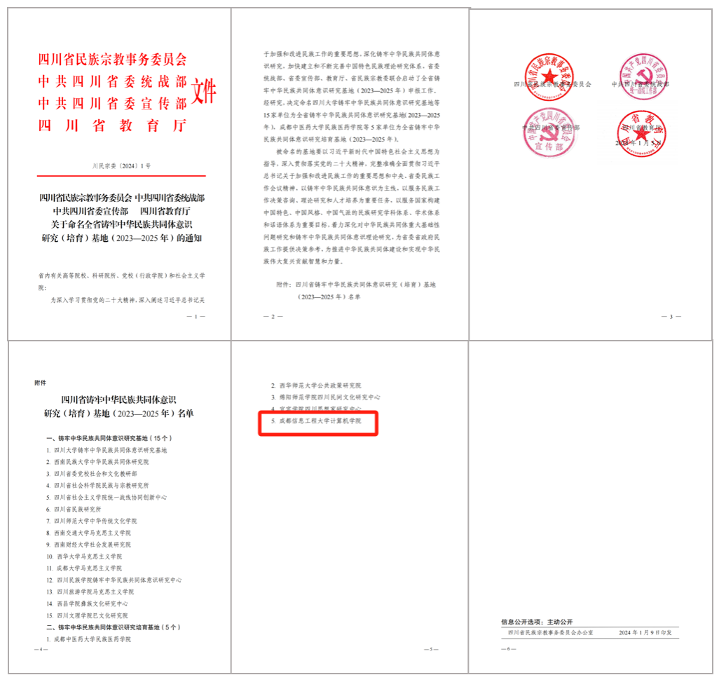 为贯彻落实习近平总书记在中央政治局第九次集体学习时的重要讲话精神,夯实铸牢中华民族共同体意识的理论基础,四川省委统战部、省委宣传部、省教育厅、省民族宗教委日前联合印发《关于命名全省铸牢中华民族共同体意识研究(培育)基地(2023—2025年)的通知》,决定命名全省首批铸牢中华民族共同体意识研究(培育)基地…[详细] 2024年01月20日